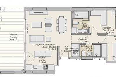 Die Wohnung verfügt über eine offene Küche, die komplett möbliert und mit hochwertigen Geräten ausgestattet ist und einen stilvollen und funktionalen Raum zum Kochen und Unterhalten bietet. Beide Schlafzimmer sind geräumig und komfortabel und verfügen über eine hervorragende Wärme- und Schalldämmung, um Ruhe und Privatsphäre zu gewährleisten.