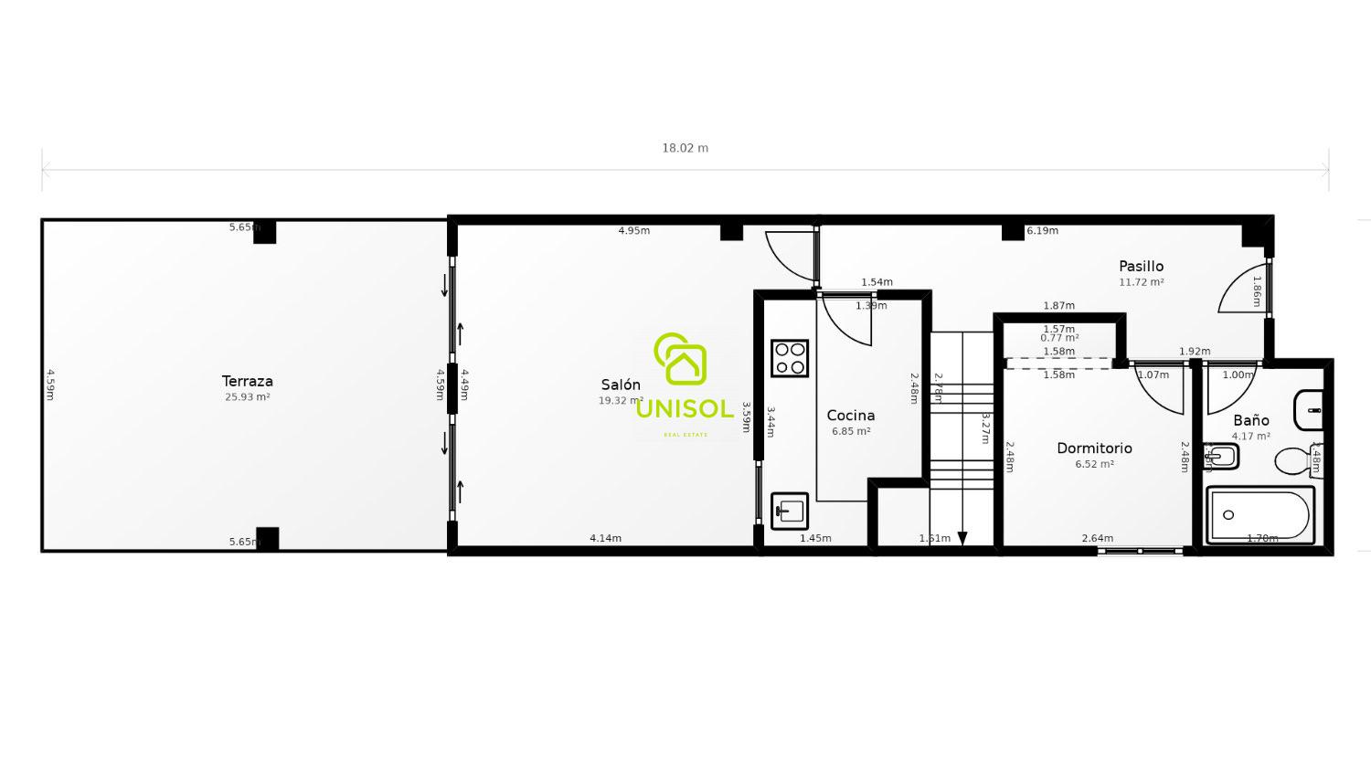 On the main floor, you will find a double bedroom with built-in wardrobe, a full bathroom, an independent kitchen, and a bright and spacious living-dining room with direct access to a generous private terrace, ideal for relaxing, dining outdoors, or enjoying the peaceful surroundings.