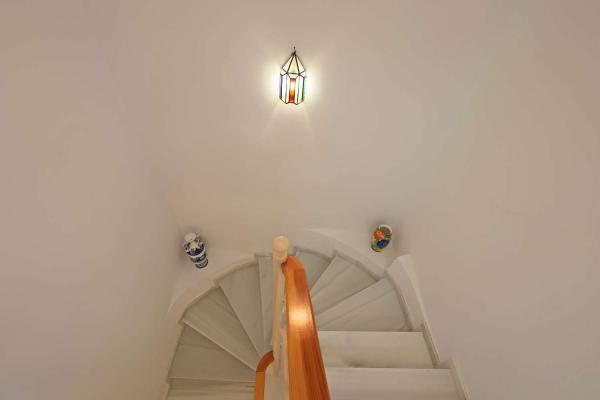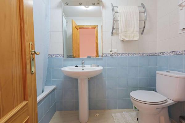 The upper floor features a welcoming landing, a full bathroom with bathtub, and two double bedrooms. One of the bedrooms includes an additional space ideal for use as a dressing area, while the other has access to its own private balcony. Both terraces offer pleasant lateral sea views and views of the residential surroundings.