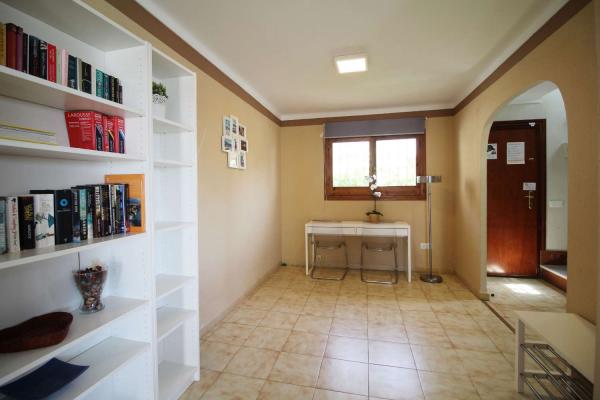 De villa is verdeeld over twee verdiepingen en beschikt over ruime, lichte en goed ingedeelde ruimtes. Op de begane grond vindt u een elegante entreehal, een gezellige woonkamer/eetkamer met directe toegang tot de buitenruimte, een volledig uitgeruste onafhankelijke keuken, een toilet en een glazen terras dat ideaal is voor de winter. Daarnaast is er een tweede terras met een uitschuifbare zonwering, perfect voor zomeravonden, en een privézwembad. Het pand beschikt ook over een berging en een privégarage naast de woning.