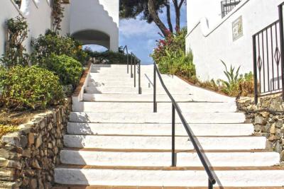 Op de begane grond beschikt de woning over een onafhankelijke keuken, een gastentoilet, een open woon- en eetkamer met open haard en airconditioning en een terras van ongeveer m2 op het zuiden met prachtig panoramisch uitzicht op zee. Beneden het terras is er nog een terras en een tuingedeelte met BBQ, een douche en een berging.