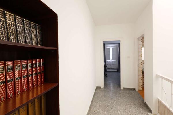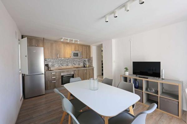 De toegang is rechtstreeks vanaf het plein en de woning is gebouwd rondom een lichte centrale patio. Op de eerste verdieping bevinden zich een gezellige woonkamer met twee balkons, een ruime recent gerenoveerde keuken met eethoek, een slaapkamer en een gemoderniseerde familiebadkamer met douche.